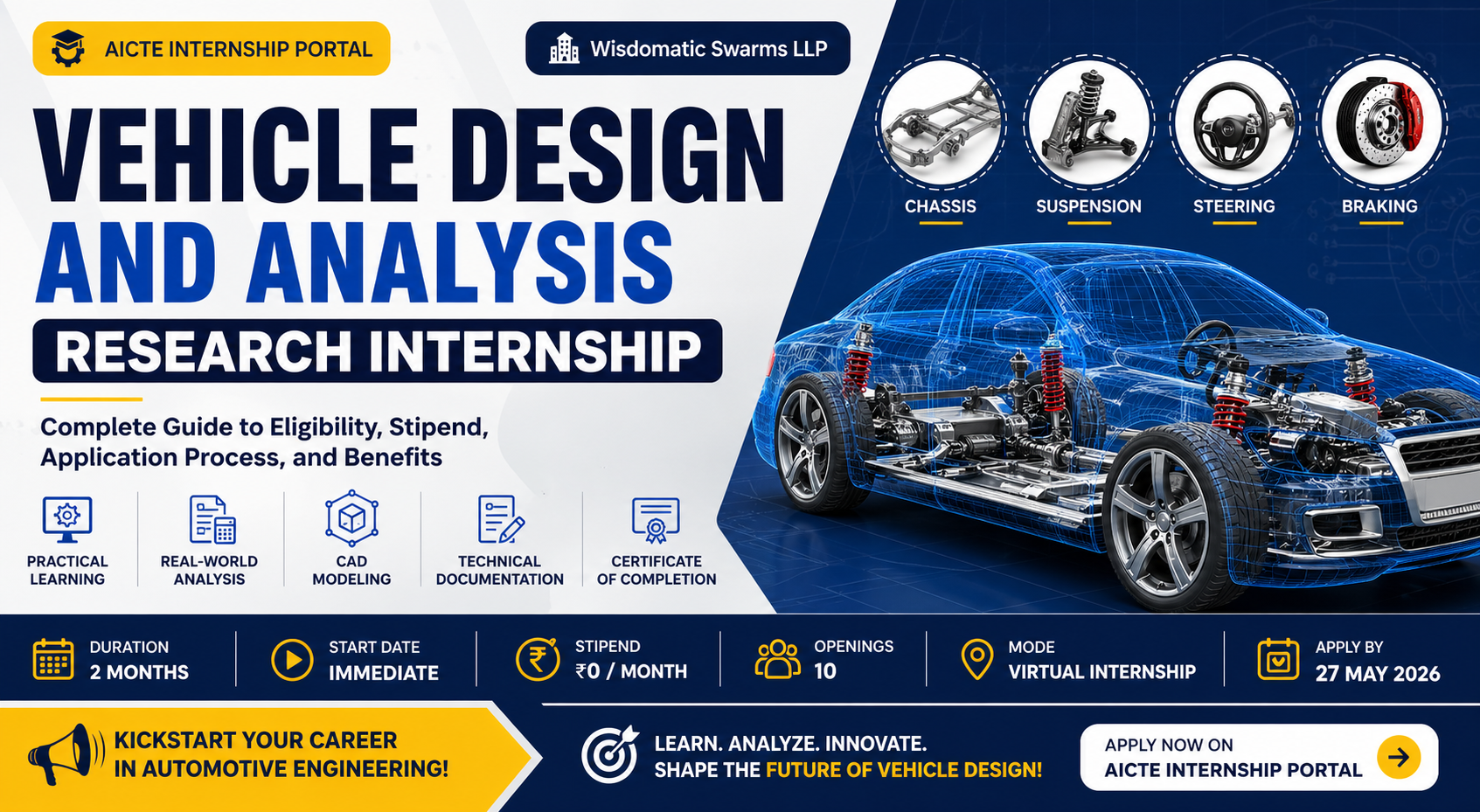This internship, offered by Wisdomatic Swarms LLP, focuses on core vehicle engineering systems such as chassis, suspension, steering, and braking systems. Moreover, it follows a research-oriented approach that helps students understand system-level design and engineering thinking.